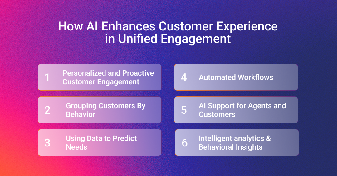 AI is the core tool inside a unified engagement platform. It drives automation, speed, and personalization. The system instantly processes large volumes of data, improving results for both customers and agents.
